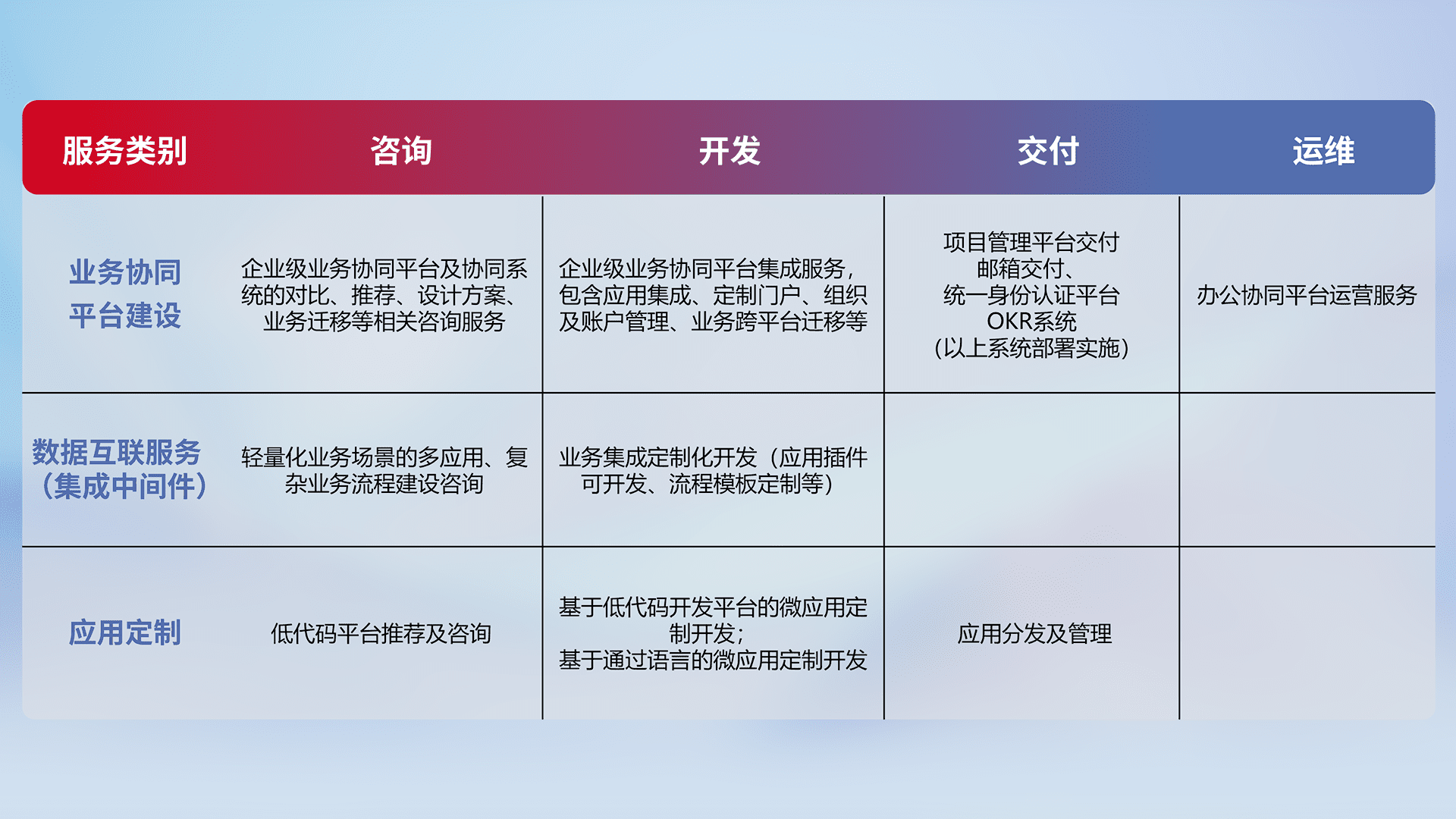 针对钉钉、、、企微、、、、IDaas等平台级产品提供产品的规划、、方案、、、、交付、、、定制化开发等服务,,,实现如统一协同办公、、、智能客户服务、、、混合会议管理、、、智能数据查询、、、、等业务场景,,,,实现数字化转型。。。