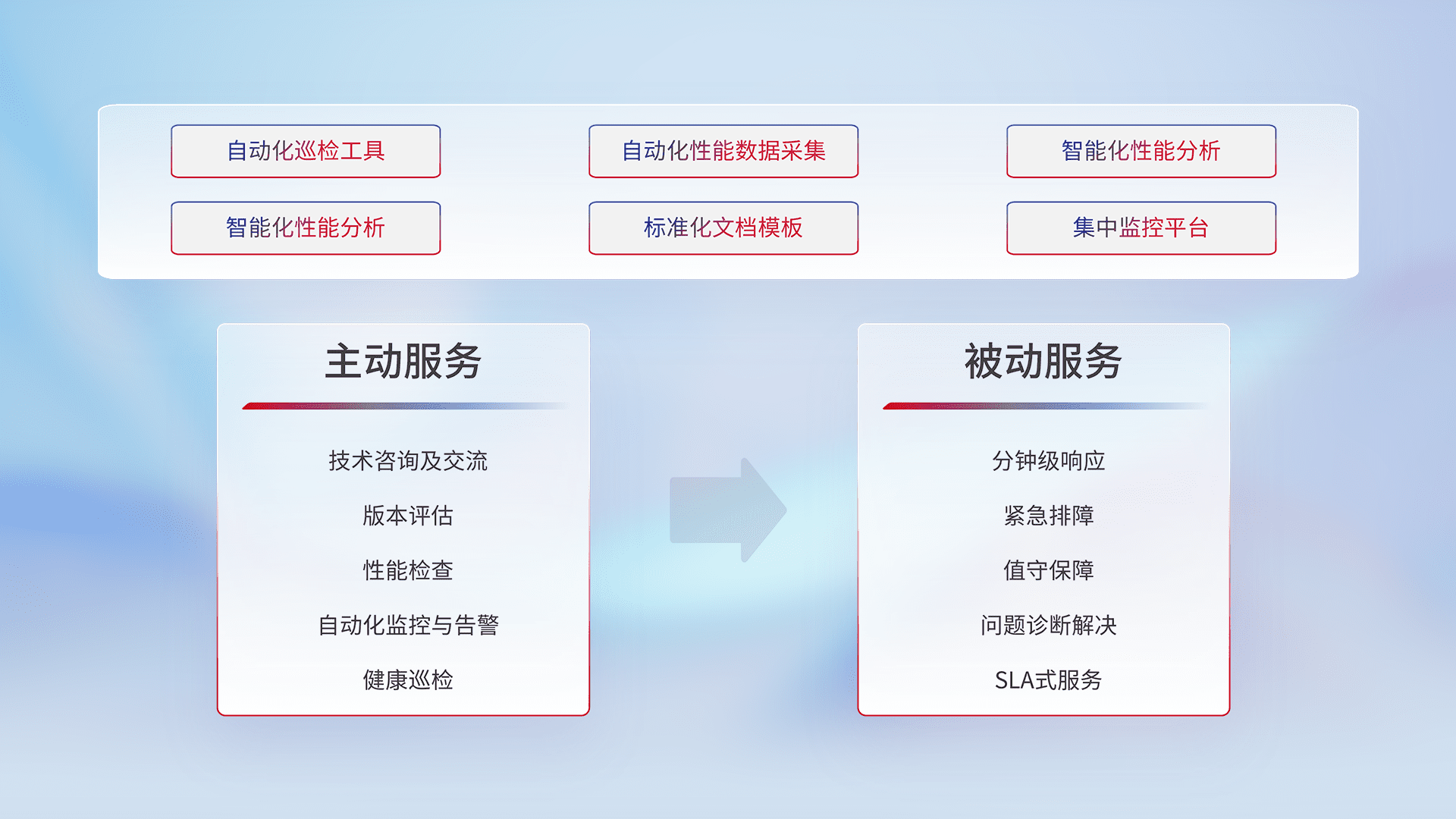 智能化工具和标准化文档,,保障服务质量,,,,提供主动服务(包含技术咨询、、版本评估、、、、性能检查、、、、自动化监控与告警、、健康巡检)和被动服务包含(分钟级响应、、紧急排障、、、、值守保障、、问题诊断解决、、SLA服务)。。。