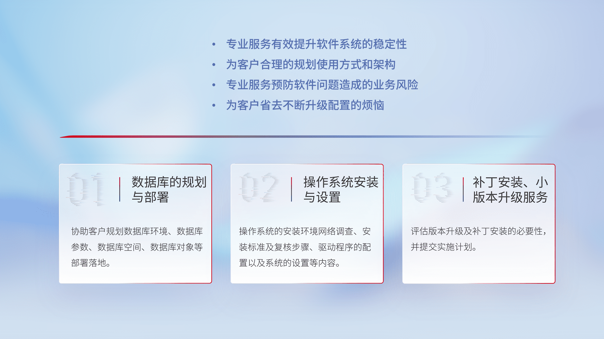 为客户提供软件规模升级、、、快速部署、、按需配置的专业服务,,,,从数据库的规划与部署到操作系统的安装与设置,,,再到补丁安装和小版本升级提供支持。。