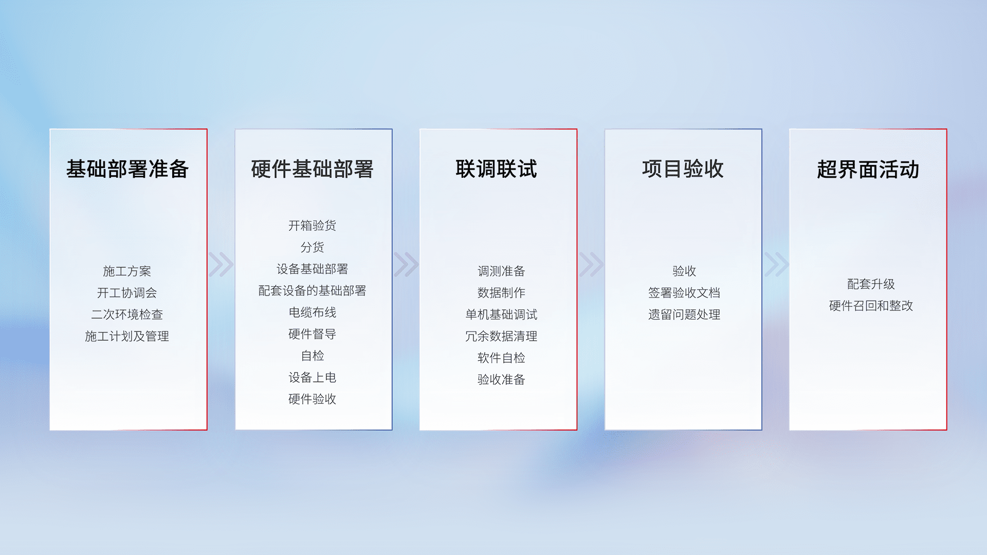 从基础部署准备、、、、硬件基础部署、、联调联试、、、、项目验收、、、、越界面活动的全过程可追溯,,保证施工质量和进度。。。。